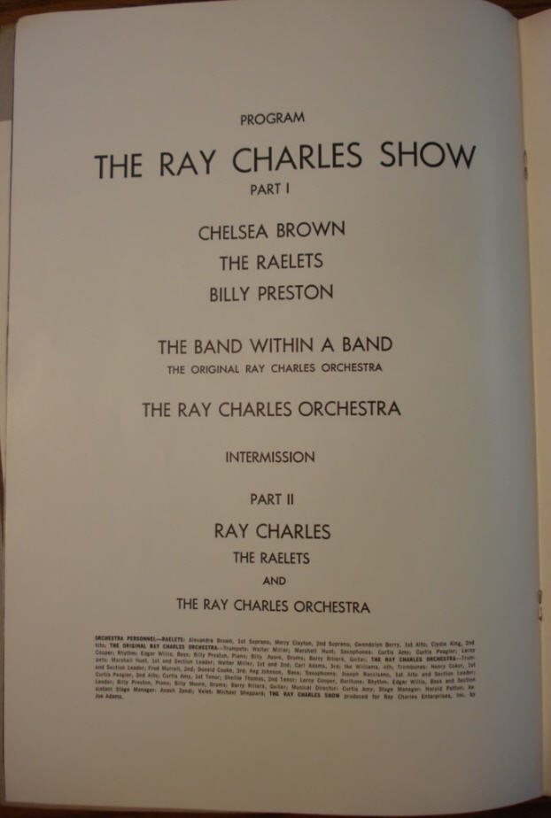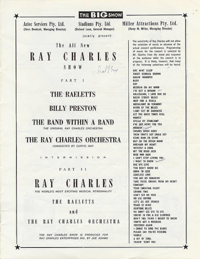Pages from Australian (August ’67) and U.S.(’68) tour brochures: announcing different mixes of The Raelettes, Billy Preston, Chelsea Brown, The Ray Charles Orchestra, and – highly intriguing – also “The Band Within A Band – The Original Ray Charles Orchestra” – I don’t have a clue what kind of act this was.