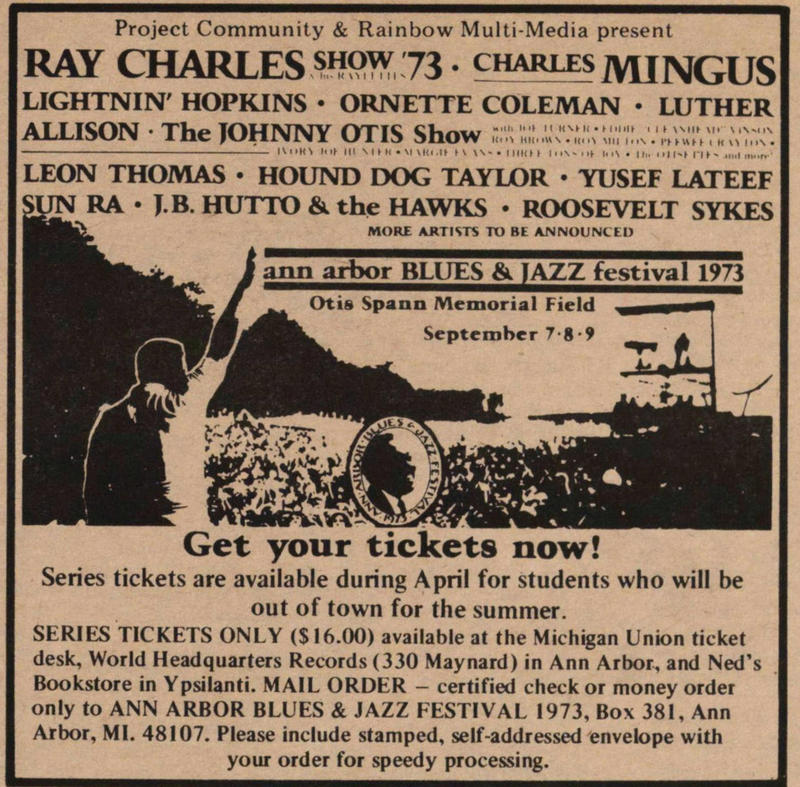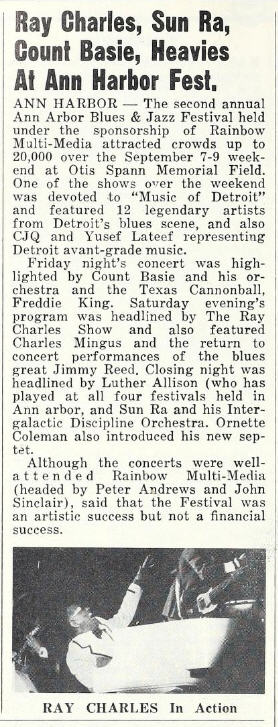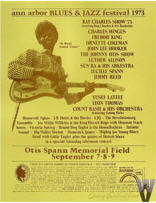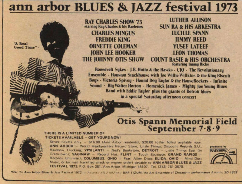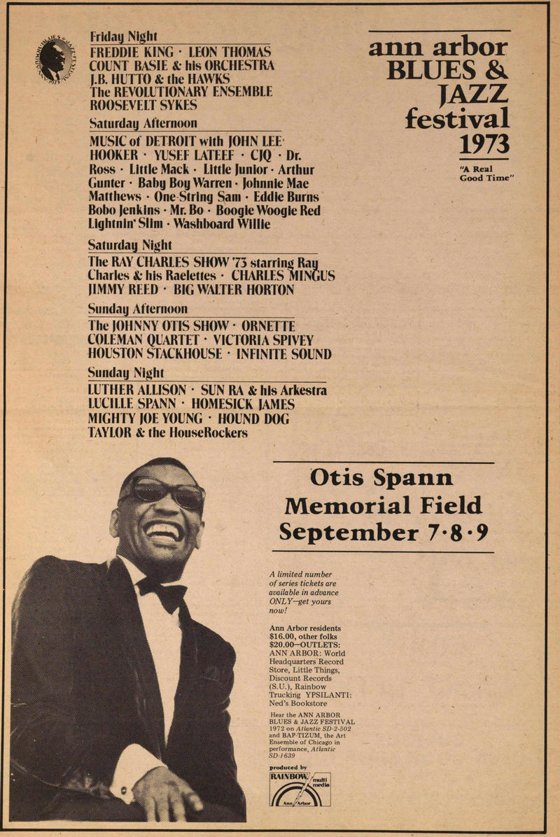 On 7 and 8 September 1973 the 4th Ann Arbor Blues And Jazz Festival took place at Otis Spann Memorial Field. The festival had been inaugurated by the University of Michigan in 1969, but was canceled in 1971. In 1972 the festival was successfully revived, and in 1973 the new organizers felt its programming was strong enough for a nation-wide live radio broadcast by NPR (over WILL AM and FM). The Ray Charles Show wound up the festival and the radio program on the Saturday evening. The entire festival was also broadcast by local station KUT-FM and KUNC, the University of Colorado’s radio station, as part of a fundraiser (sources: Greeley Daily Tribune, Waterloo Iowa Daily Courier, 7 Sep. 1973).